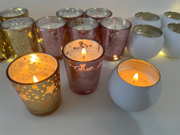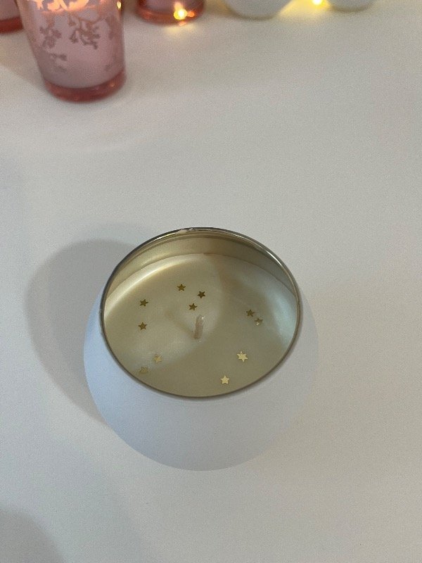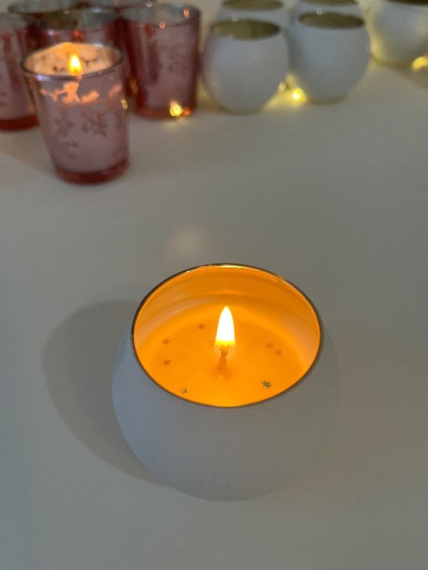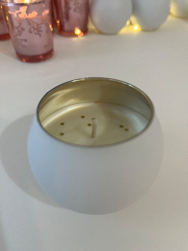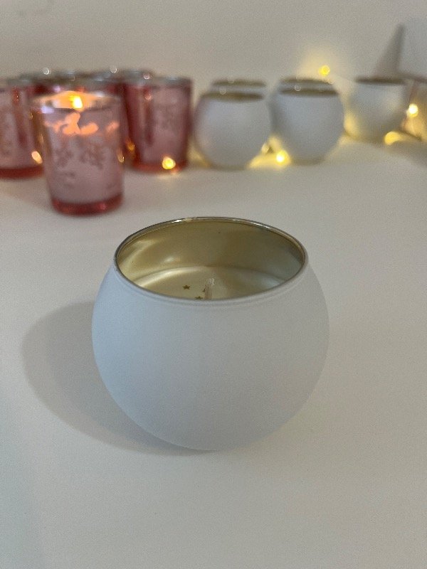 Vela hermosa en forma de globo, color blanco y por la parte interna en color dorada, vertida a mano con cera de soja